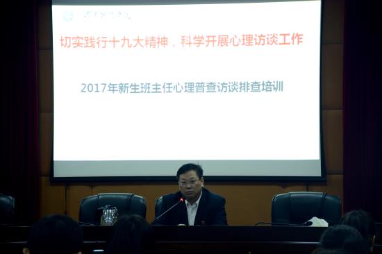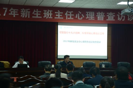 11月8日晚7:30在行政楼八楼一会议室召开新生班主任心理普查访谈排查工作培训会议。学工部长唐华山、学工负责人李连胜、高丹、潘清远及2017级全体新生班主任、辅导员、心理专干共计100余人参加。