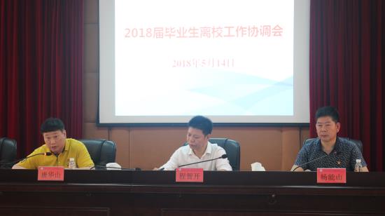 会上,学工部长唐华山首先对我校毕业生的基本情况做了简要介绍,根据2018届毕业生离校工作方案,对毕业生离校工作进行了总体安排和部署,并同各部门就毕业生离校工作过程的相关问题进行了研讨,要求全校工作人员对学生“关注、关心、关爱”,确保毕业生“安全、文明、有序、愉快”离校。