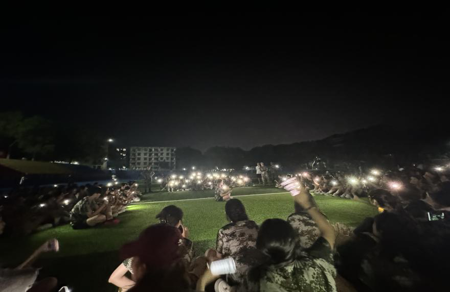 军训场地,旅游与文化产业学院的新生们在军训场上围坐一团,用灯光、军歌、校歌、舞蹈、互动游戏,点燃了一场“月华圆满正秋中,天上人间此夕同”中秋晚会气氛。