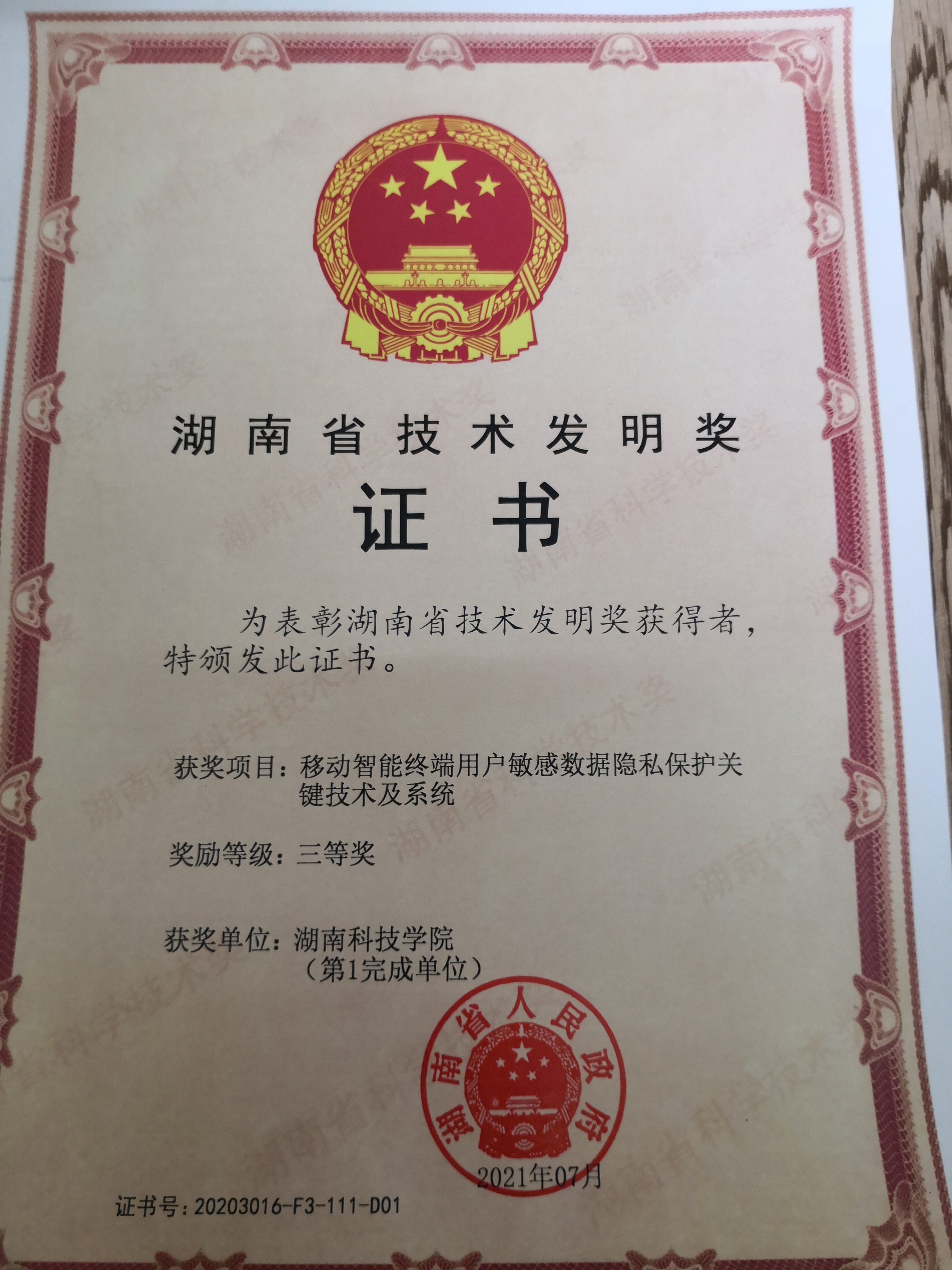 本网讯(通讯员 颜叶娟) 7月21日上午,湖南省科技创新奖励大会在长沙召开。会议表彰了2020年度湖南省科学技术奖励(含光召科技奖),米兰官方端网页版作为第一单位有4项项目获奖。其中我院教授罗恩韬主持的“移动智能终端用户敏感数据隐私保护关键技术及系统”获湖南省技术发明奖三等奖。