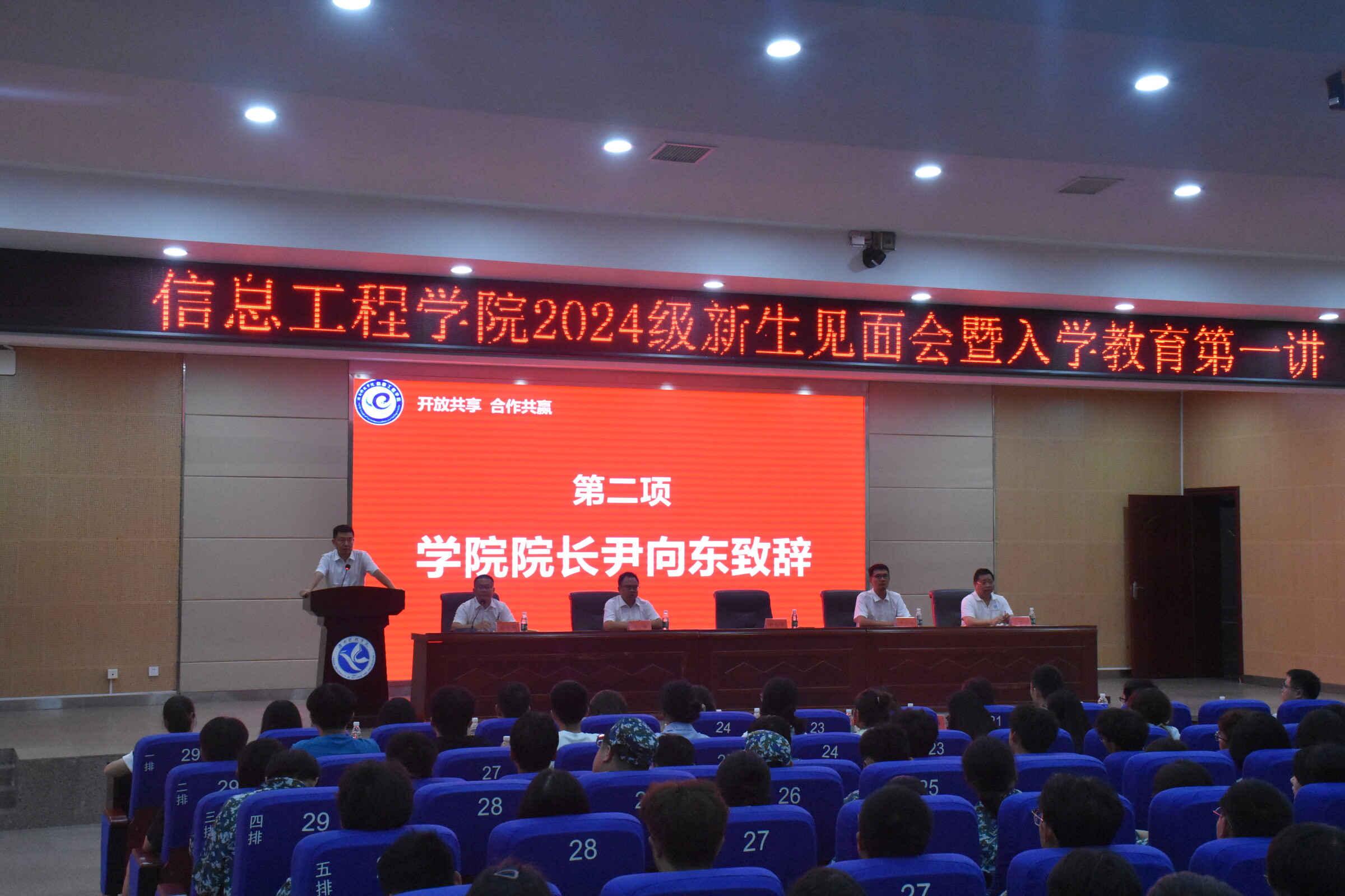 见面会在庄严的国歌声中拉开序幕。院长尹向东代表学院全体师生对511名来自全国各地的新生表示热烈欢迎。他从学院概况、人才培养、科学研究、社会服务等方面进行院情介绍,勉励同学们积极响应习近平总书记的号召,听党话、跟党走,做有理想、敢担当、能吃苦、肯奋斗的新时代好青年。他对2024级新生提出三点希望:一是要勇立时代潮头,自觉担负起时代赋予的神圣使命,做有政治素质和道德素养的一代新人。二是要认认真真、勤勤恳恳、扎扎实实,塑造工匠精神,练就过硬专业本领。三是要敢于开拓创新,做会主动学习和善于思考的高水平应用型人才。